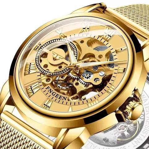 Fngenen男性用自動ステンレスメッシュベルト時計防水発光ダイヤモンド両面中空ステンレス